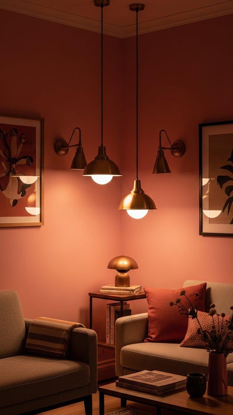 Anchor warm pink walls with brass lighting to add instant polish and a soft metallic glow. You’ll layer brass pendants over seating and mix vintage sconces beside art to create depth. Let warm pinks; blush tones read modern and liberated, pairing streamlined fixtures with relaxed furniture. You’ll control mood with dimmers, balancing shimmer and softness for a confident, free-spirited space.