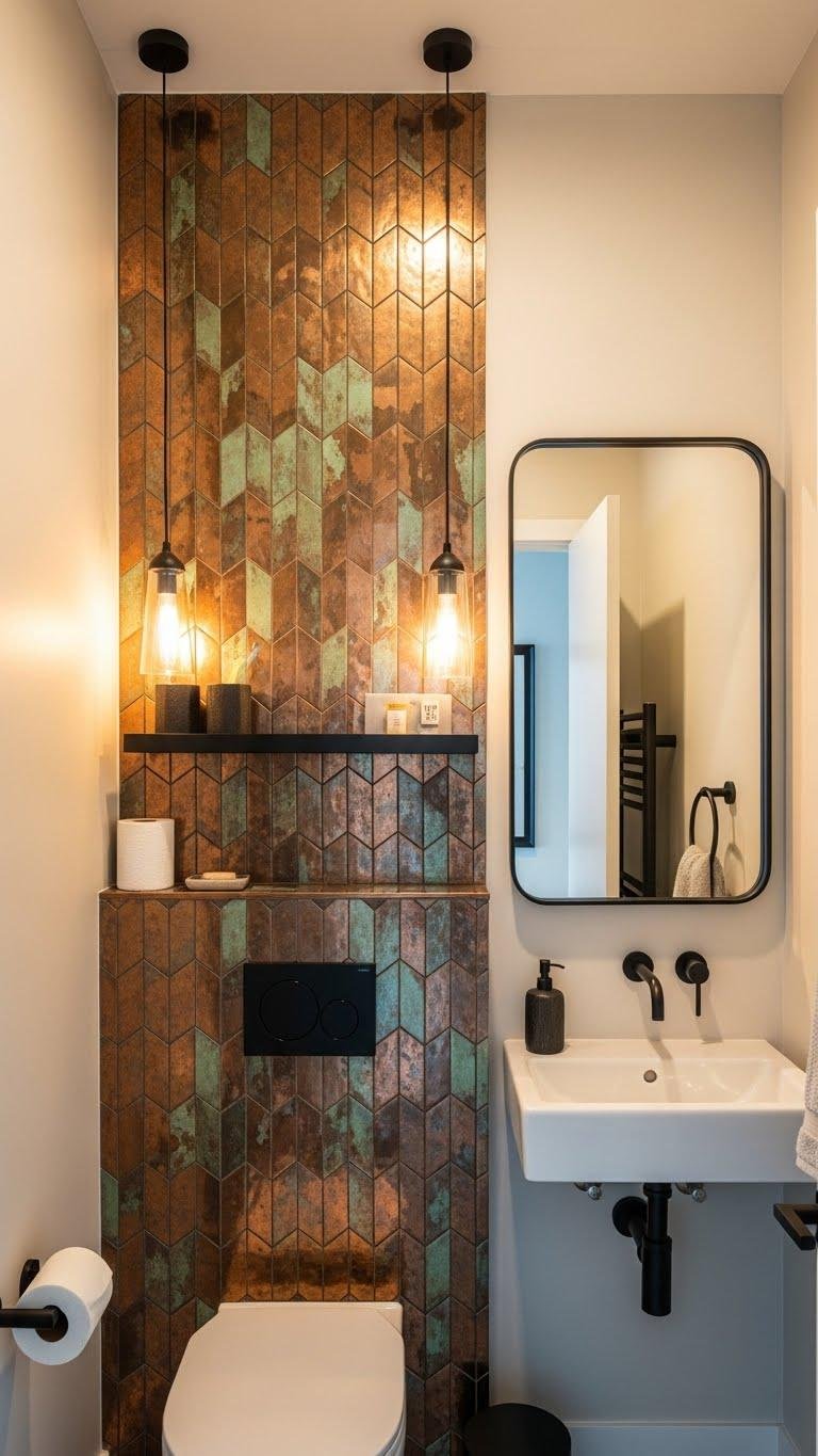 Drawing a compact room’s eye upward, a copper-tiled accent wall turns a powder room into a luxe statement without overwhelming the space. You’ll choose tiles with oxidized patina for depth and warmth, arranging them in a geometric mosaic that reads modern yet timeless. Pair with matte fixtures, minimal shelving, and bold mirror lines to keep the vibe liberated, refined, and effortlessly curated.