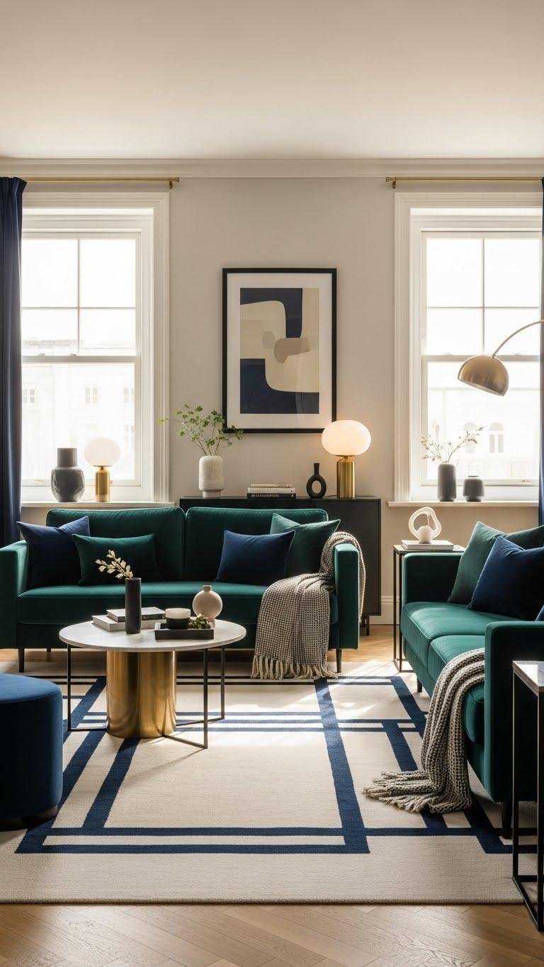 When you pair deep emerald upholstery with navy accents and a crisp geometric rug, the room feels simultaneously luxe and modern—each hue amplifies the other’s richness while the rug grounds the palette with clean lines and scale.