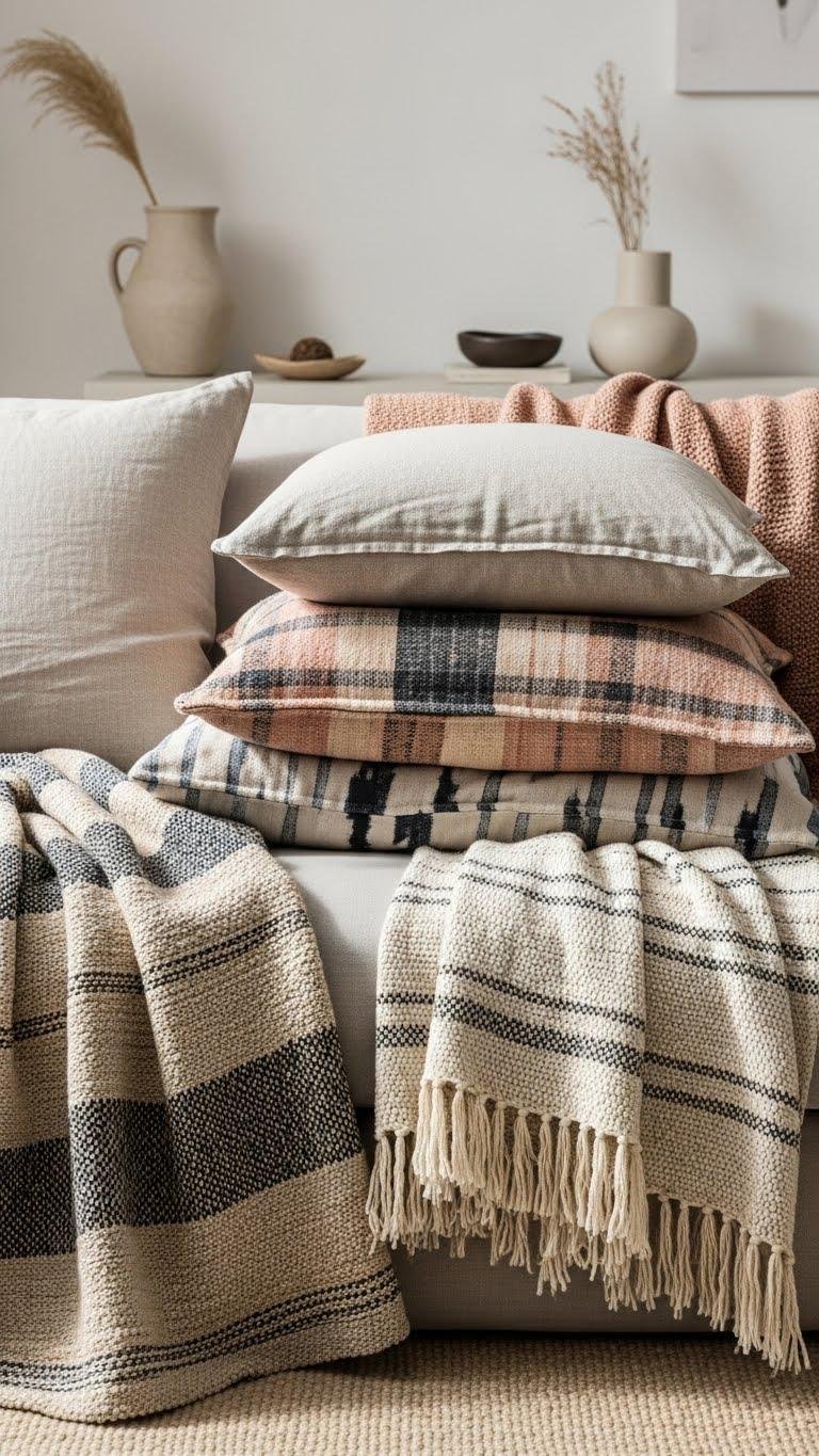 Layer handwoven textiles across a minimal sofa to instantly introduce warmth, texture, and artisanal character without cluttering the clean lines. You’ll pair textured throws in muted palettes with airy cushions, letting natural dyes and subtle irregularities read as intentional.