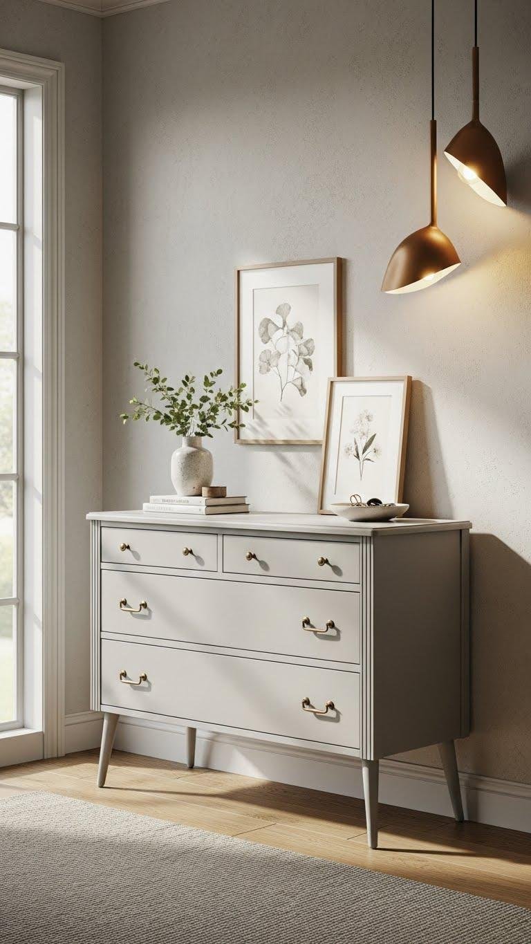 Anchor your entryway or living room with a repurposed antique dresser turned console table to add instant character and smart storage without sacrificing style. You’ll modernize it—clean lines, fresh finish, preserved distressed hardware—and pair it with sculptural lighting and simple art. Tapered legs keep proportions airy, letting you express independent taste while enjoying practical drawers for keys, mail, and liberated living.