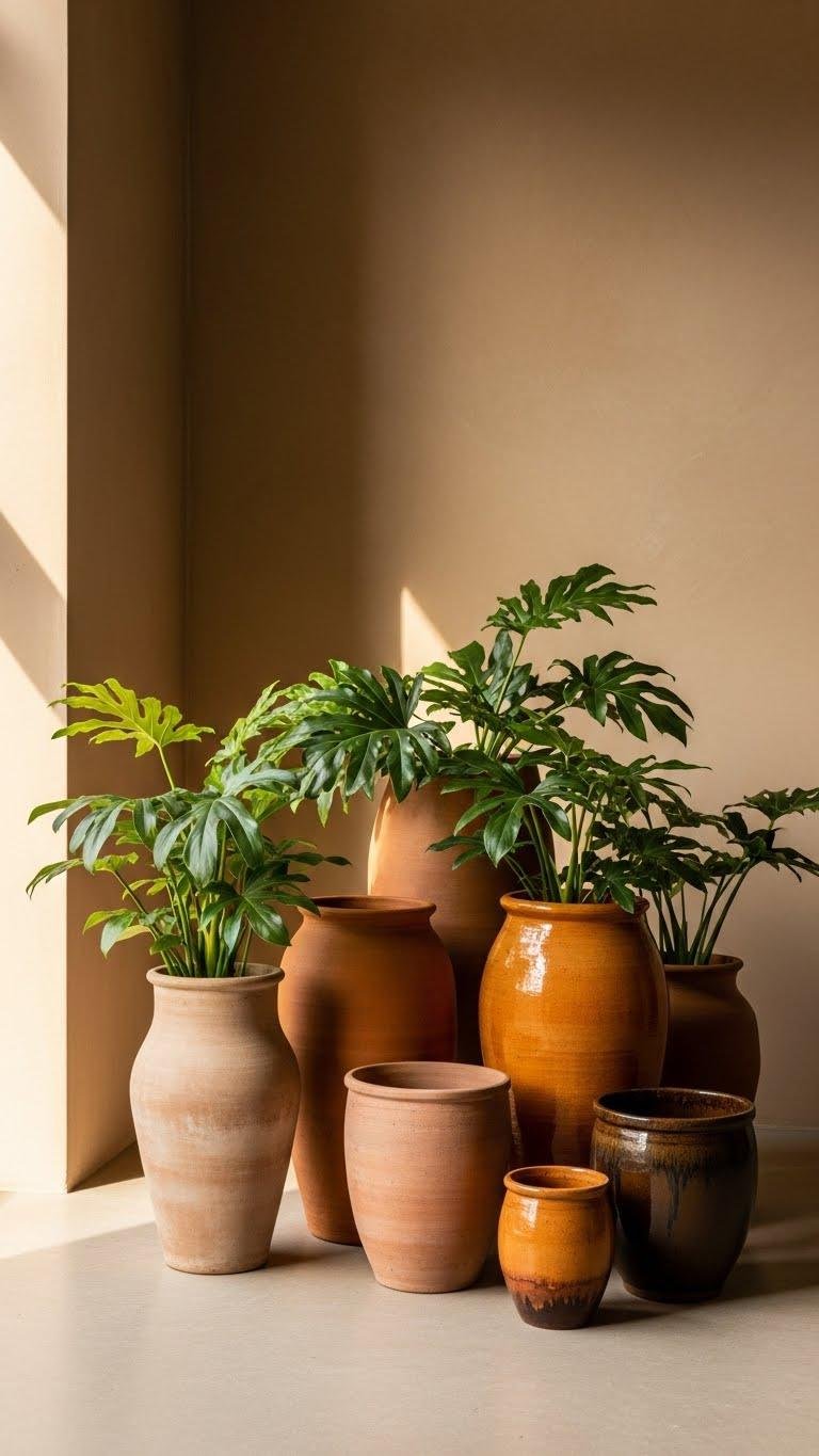 Create a calm, gallery-like plant corner by grouping terracotta pots of varying heights and finishes against a textured wall, letting the warm, earthy tones ground the arrangement while verdant foliage adds sculptural contrast. You’ll embrace terra cotta authenticity, refine plant styling with mixed textures, and execute pot grouping for balance. Prioritize sunlight placement, rotate specimens, and leave room to rearrange as your taste evolves.