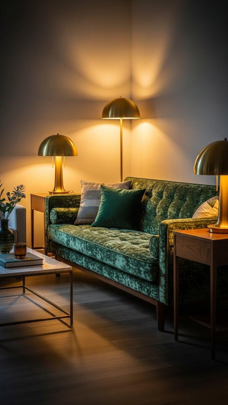 You’ll choose crushed velvet upholstery and a midcentury silhouette to evoke timeless ease, then layer brass accents for warmth. Anchor the vignette with a sleek cocktail table, letting light and texture free you to relax stylishly.