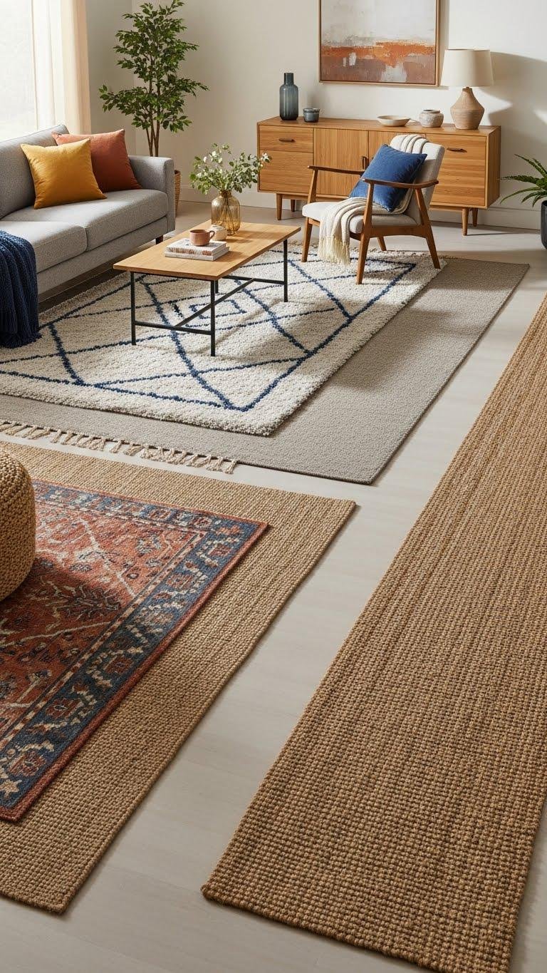 Layering rugs lets you carve out distinct zones in an open living area while adding texture and personality—start with a large, neutral base that anchors furniture, then place a smaller, patterned or high-pile rug where you want visual emphasis, like under a coffee table or reading chair. Mix jute runners for warmth, experiment with color zoning, and keep proportions bold yet breathable.