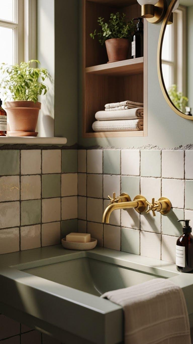 You’ll celebrate artisan tiles with complementary fixtures, matte brass accents, and open shelving.