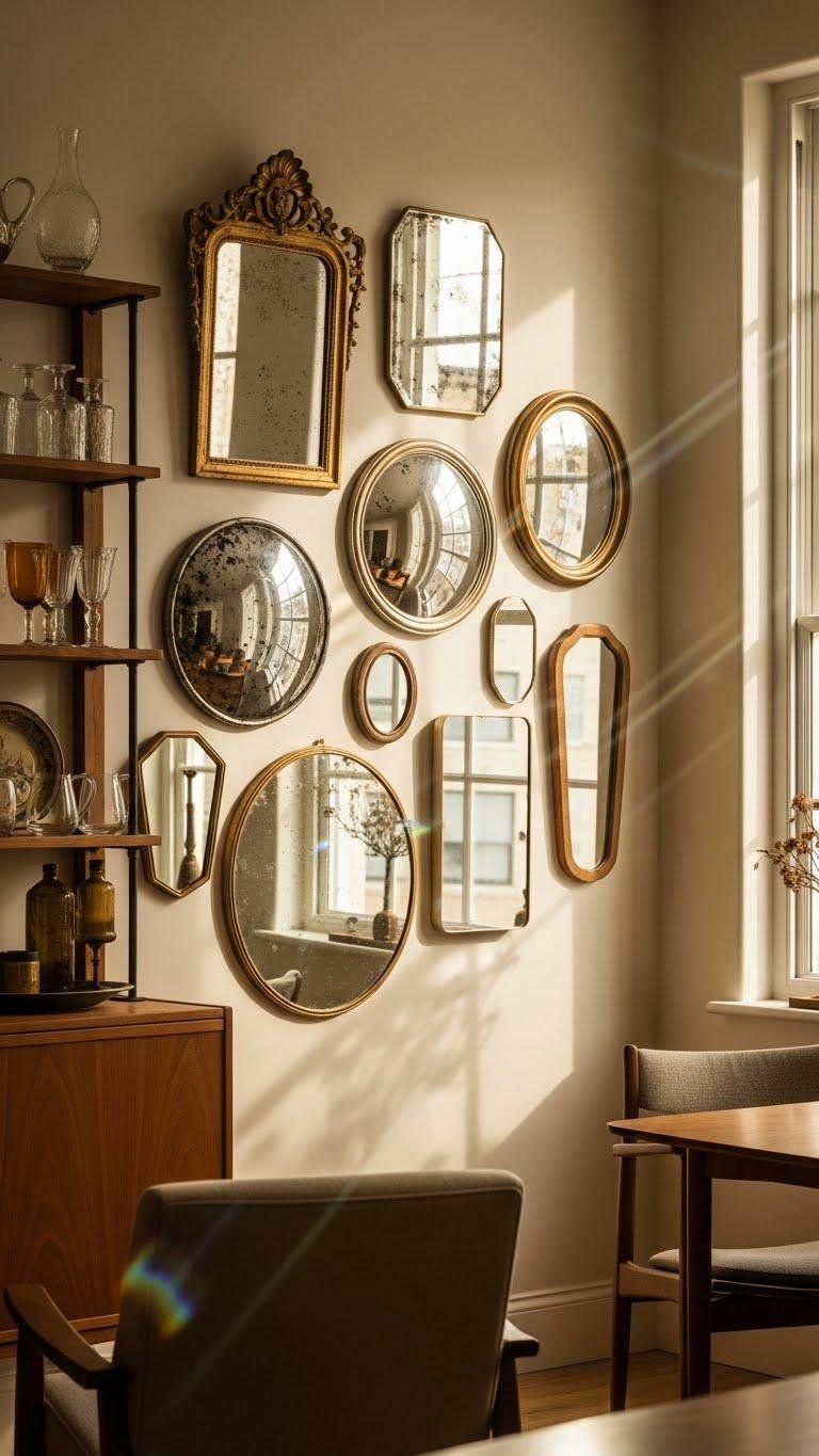 Group a collection of vintage mirrors to bounce light across the room and create an instant focal point — mixing shapes, sizes, and patinas turns reflective surfaces into layered decor rather than mere utility. You’ll curate a confident mirrored grouping that reads like art, pairing ornate frames with minimalist pieces, interspersing antique glassware on nearby shelves, and positioning for maximum daylight to amplify space and personal style.