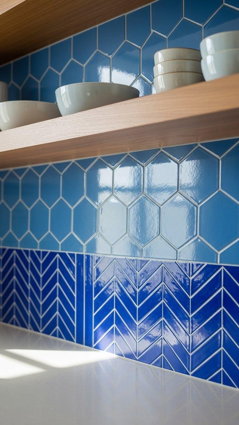 Make a bold splash with a statement blue ceramic tile backsplash that instantly anchors the room and sets a confident tonal mood. You’ll choose glazed hexagons for tactile depth or cobalt chevrons for directional drama, pairing matte grout and open shelving to keep things airy.