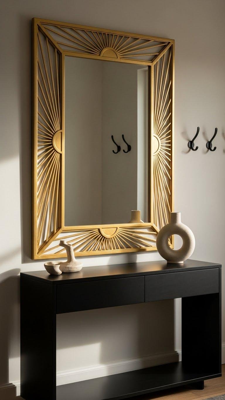 When you step through the door, a gold-framed Art Deco mirror commands attention, reflecting geometric lines and warming the entry with vintage glamour. You’ll pair gold accents with matte black hooks, a streamlined console, and a sculptural vase to keep the look airy.