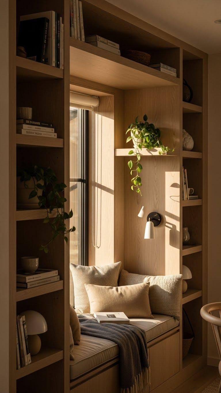 While natural light pours in, settle into a cozy reading nook framed by warm, natural wood shelving that keeps your books, plants, and small curios organized without feeling fussy. You’ll curl up on a window seat layered with soft throws, enjoy ambient lighting for evening pages, and use built in storage to hide clutter — a liberated, refined retreat that feels effortless.
