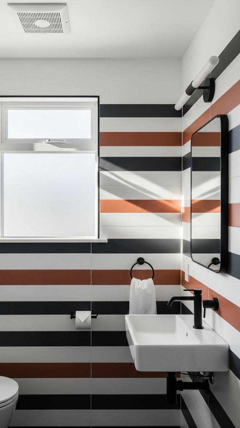 If colorful encaustic tiles gave your kitchen a joyful, artisanal anchor, carry that same energy into the bathroom with bold, graphic stripes that read modern and effortless. You’ll choose crisp tile bands, rich contrast grout to sharpen geometry, and monochrome fixtures to let pattern sing.