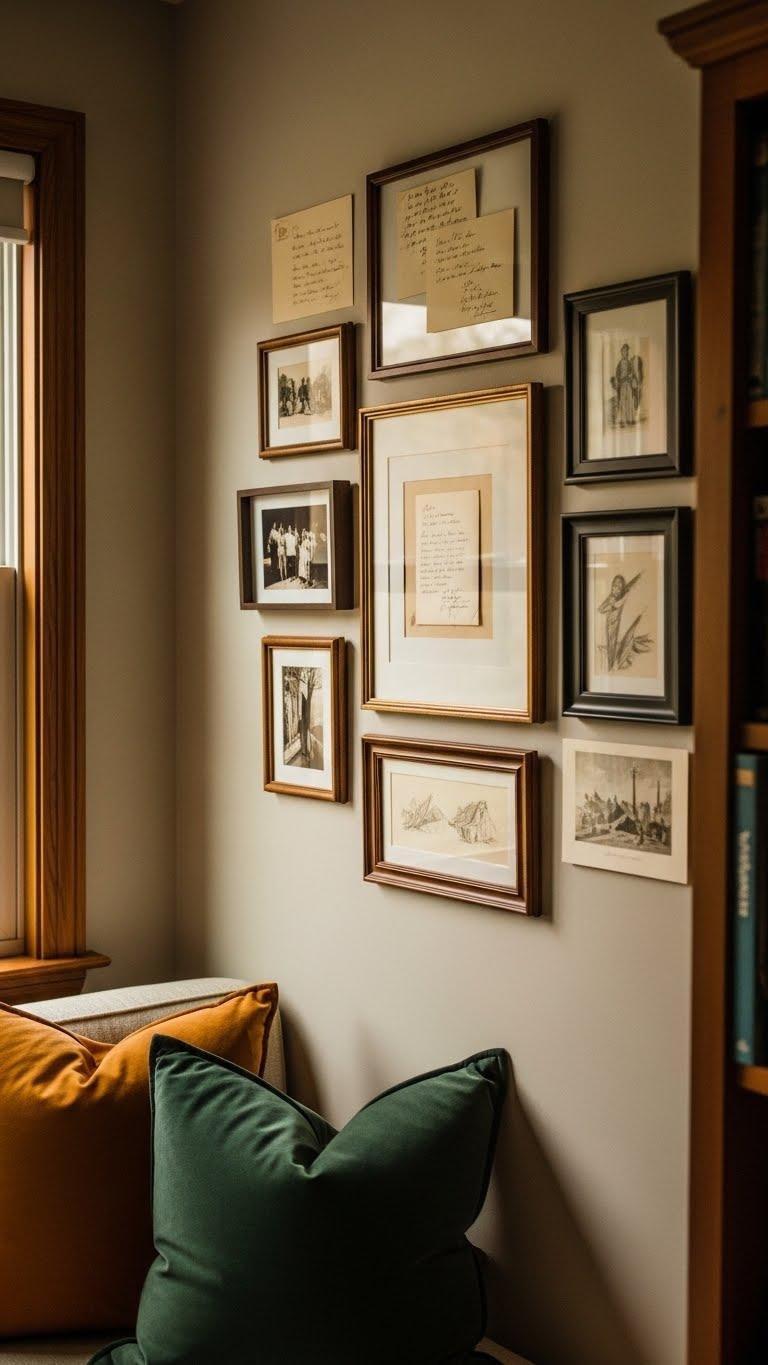 Once your reading nook feels like a private retreat, bring that same intimacy to the walls by curating a gallery of personal art that tells your story. Choose a confident mix: framed loveletters, heirloom photographs, original sketches and prints. Keep consistent matting, varied frame sizes, and a deliberate grid or organic cluster. Hang at eye level and edit ruthlessly for clarity and emotional impact.