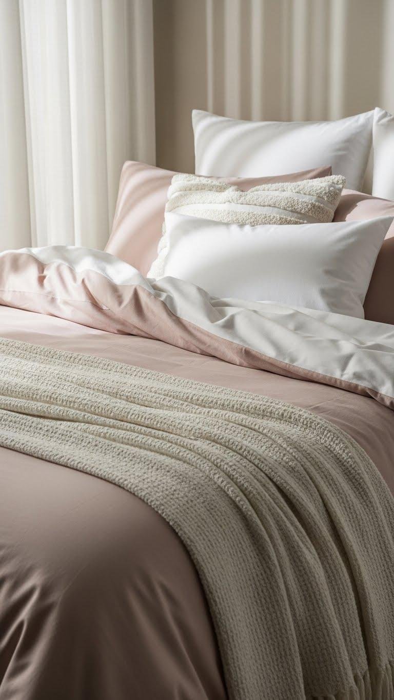 Layer soft blush and crisp white textiles to create a bedroom that feels both indulgent and intentionally restrained. You’ll choose a blush duvet as the anchor, then add white throws for contrast and texture. Mix matte and satin finishes, vary pile heights, and keep patterns minimal. Tuck corners, layer pillows sparingly, and let calm, liberated elegance define the space.