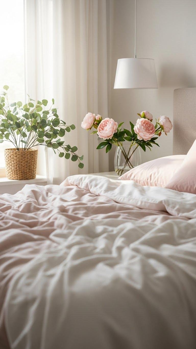 Place a potted eucalyptus near a window for scent and movement, and arrange faux peony stems in a low glass vase on your nightstand.