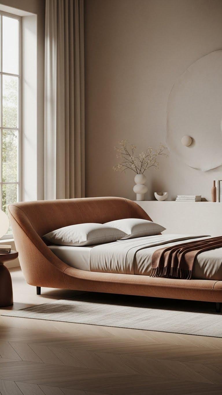 Anchor the room with a curved sculptural bed frame that reads as both furniture and art, and you’ll instantly soften corners while creating a sensual, enveloping focal point.