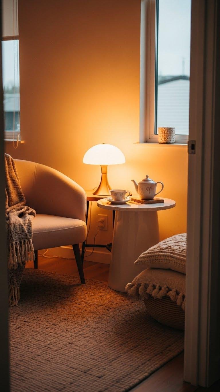 Keep textiles soft, a lamp warm, and a compact tea service close at hand for effortless, unhurried moments.