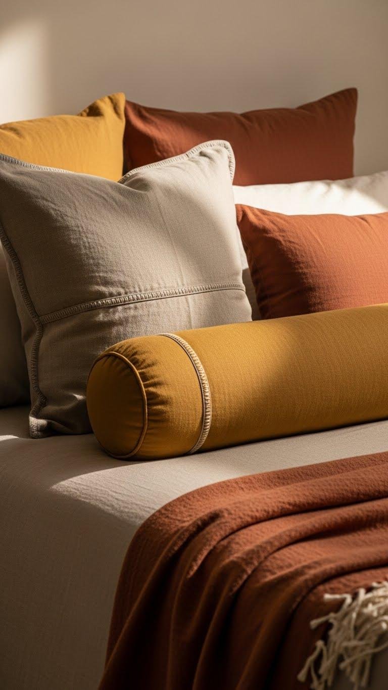 Bring in muted mustard and terracotta accent pillows to anchor a neutral scheme with warm, sophisticated color — they add depth without shouting. Choose linen pillows and hand stitched details for tactile luxury; pair them with terracotta throws for layered warmth.