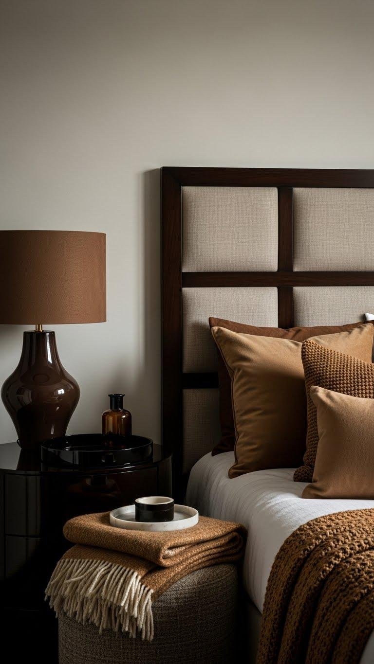 Once your paneled headboard establishes the room’s architecture, introduce dark chocolate and camel accessories to add warmth and sculptural contrast. Layer dark chocolate accents—a sculpted lamp base, lacquered tray, folded blanket—and place camel throw pillows with varied textures for movement. You’ll balance depth and light, anchor seating, and keep the scheme liberated yet intentional, inviting touch without overpowering intimacy.