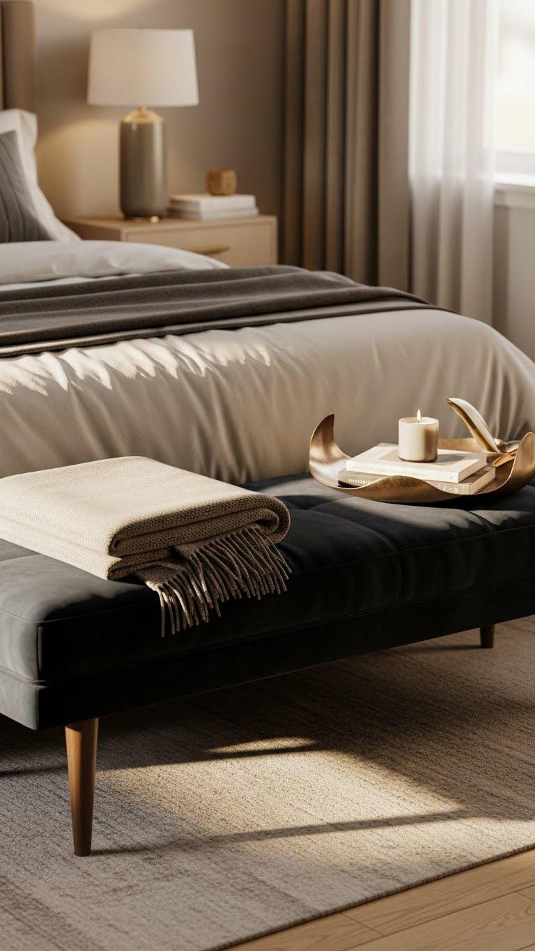 Tuck a low-profile velvet bench at the foot of your bed to anchor the room and introduce instant glamour and tactile warmth. Choose rich tones and streamlined legs that let you move freely; opt for velvet storage to hide throws and lingerie.