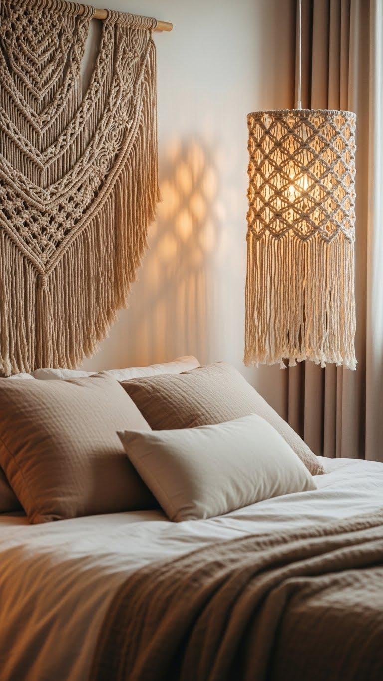 Hand-knotted macramé pieces add sculptural warmth and artisanal texture to a romantic bedroom, giving you handcrafted detail that contrasts softly with polished finishes. Choose hand knotted wallhangings to anchor a bed or cozy corner, layer soft neutrals, and pair with macramé lampshades for intimate, diffused light. You’ll curate a liberated, tactile sanctuary that feels personal and effortlessly refined.