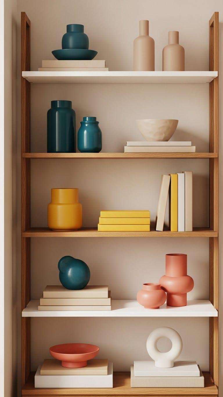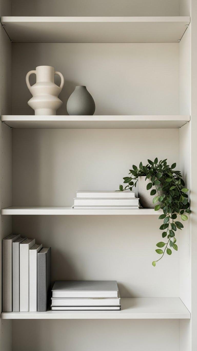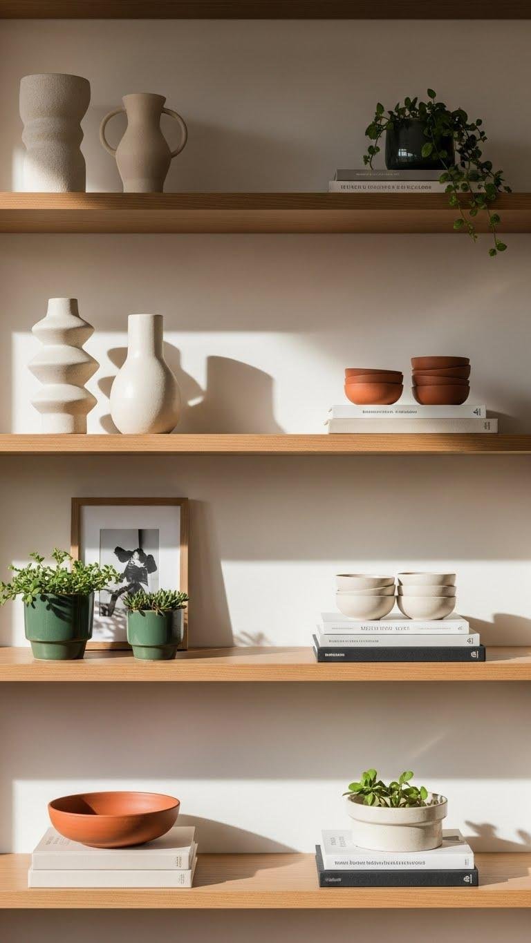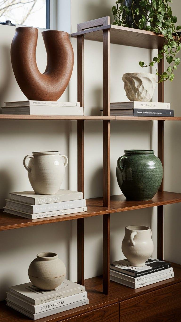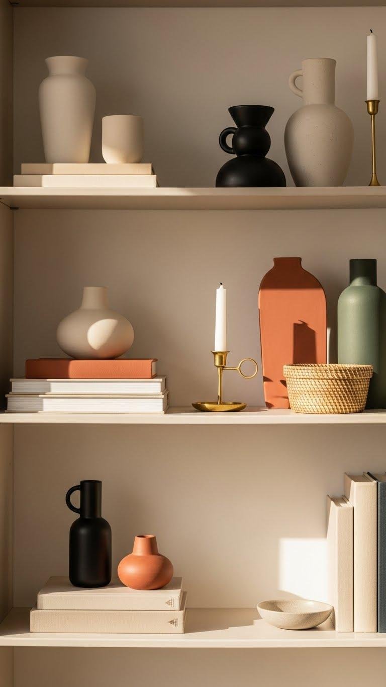 When you arrange shelves, counterbalance visually heavy pieces—like large sculptures, stacked books, or thick ceramic vases—by placing comparable-weight items on the opposite side or directly across adjacent tiers; this keeps the composition stable and your eye moving.