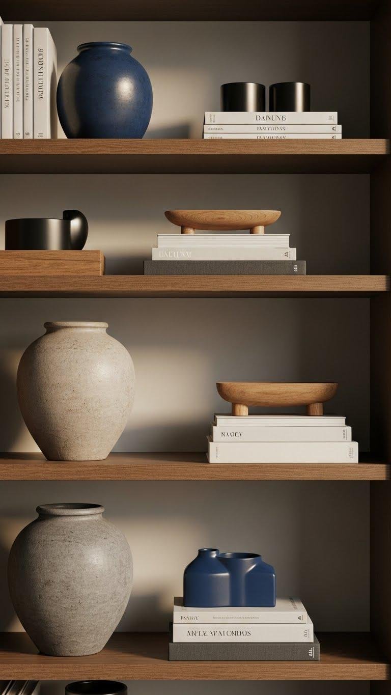 You’ll place a large vase here, a sculpture there, calibrating color balance and shelf spacing to keep momentum.