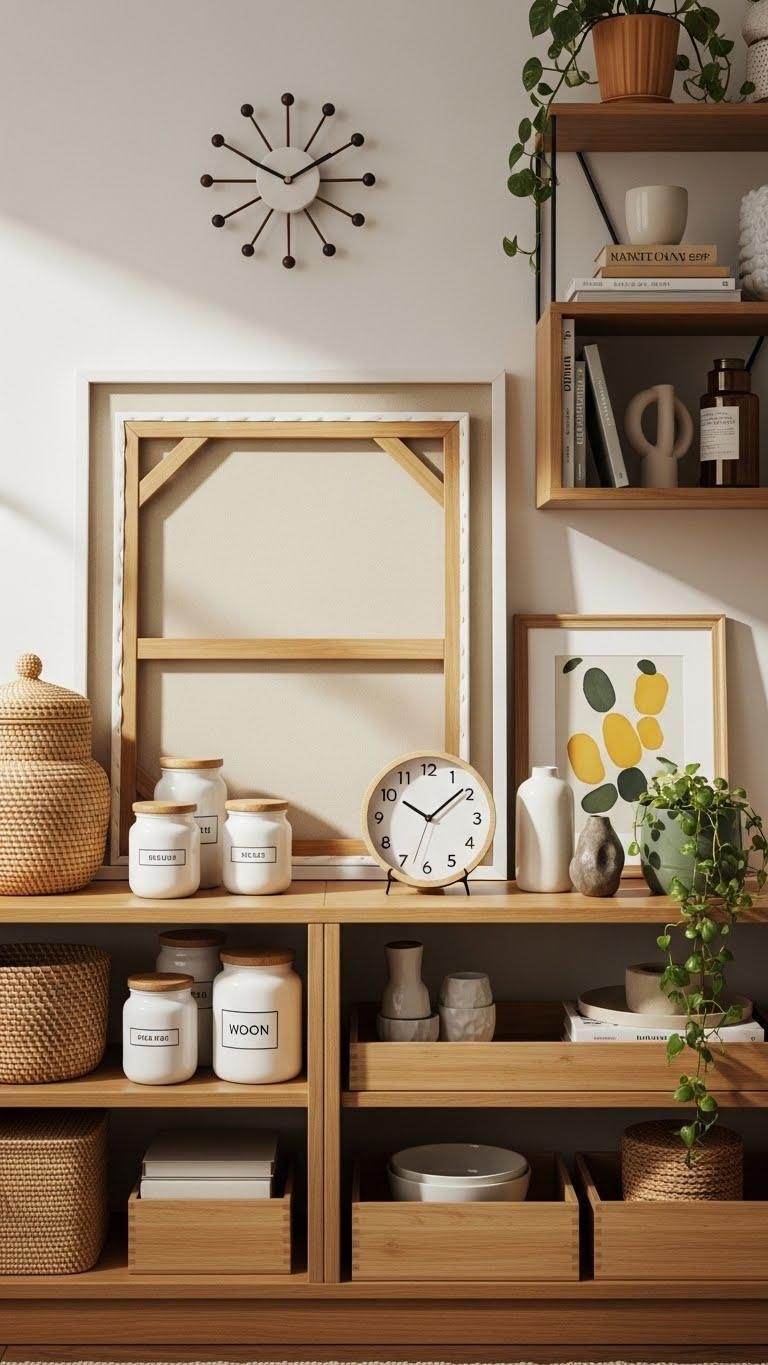 Leaning framed art sets the mood and establishes layers, so you can build on that foundation by mixing useful objects with decorative accents. Let functional pieces—stylish baskets, labeled jars, or a chic clock—serve utility aesthetics without sacrificing form. Tuck essentials into hidden storage like boxes or drawer trays, and alternate textures so every shelf feels intentional, liberated, and practical.