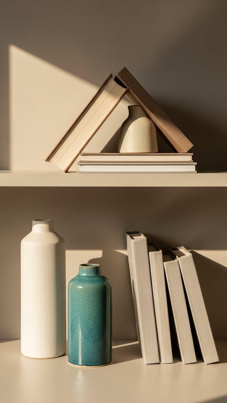 After you’ve balanced heavy pieces across shelves, start composing groups that guide the eye—visual triangles are one of the most effective tools for that. You’ll form one with an asymmetrical vase pairing, a stack of books and a tilted book vase to imply movement. Place varied heights and negative space deliberately so each point anchors the trio, keeping the arrangement airy and liberated.