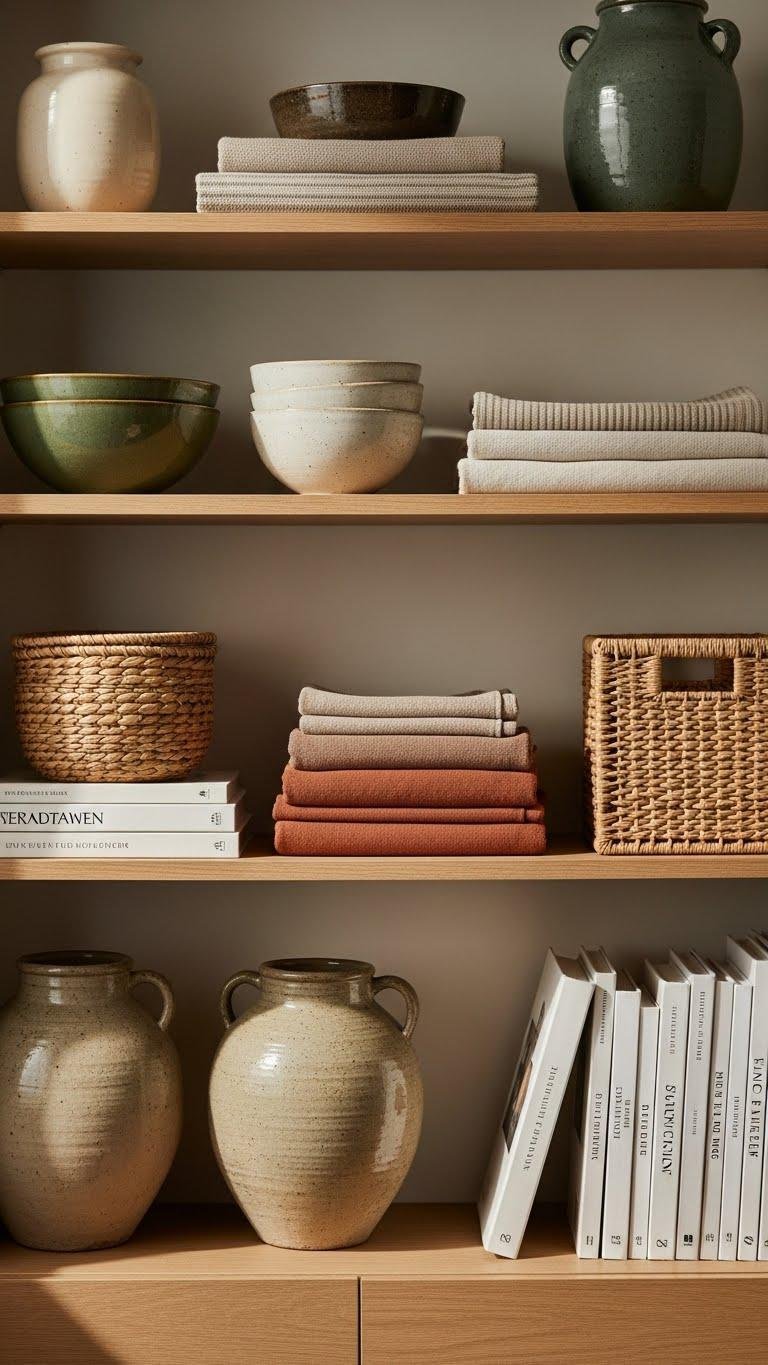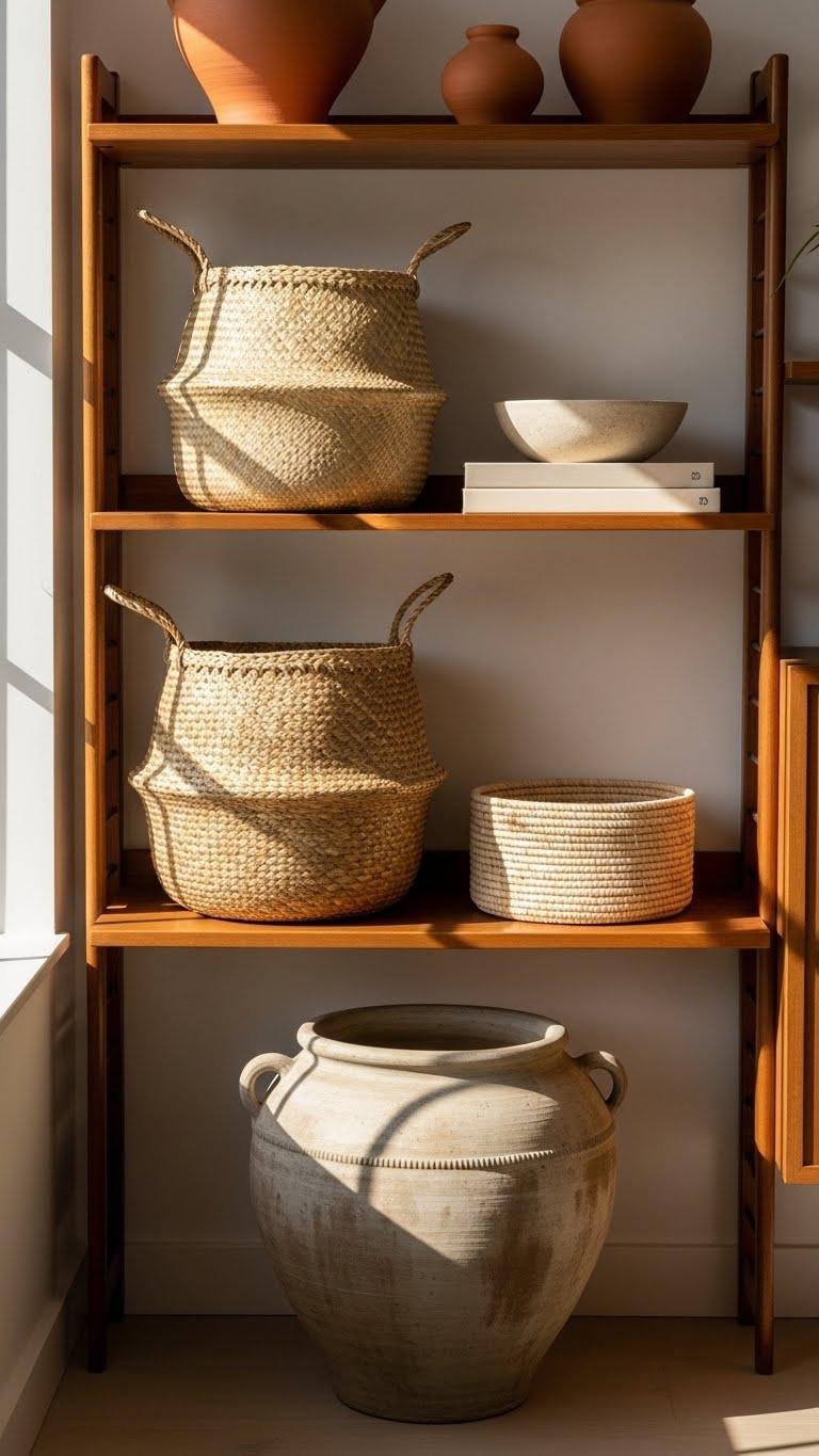Ground larger baskets or earthenware at the base of a shelf to anchor the arrangement and balance vertical weight.