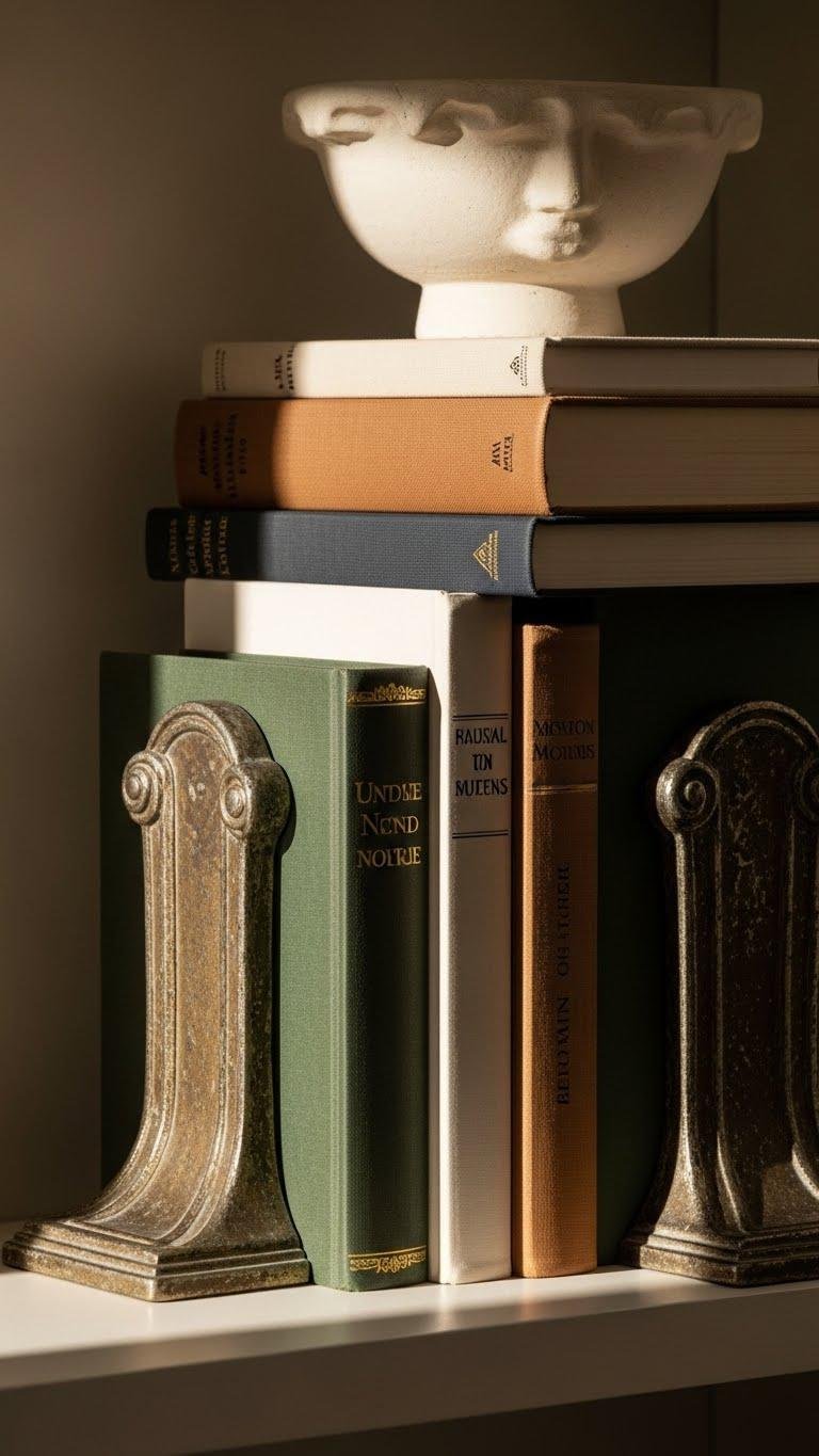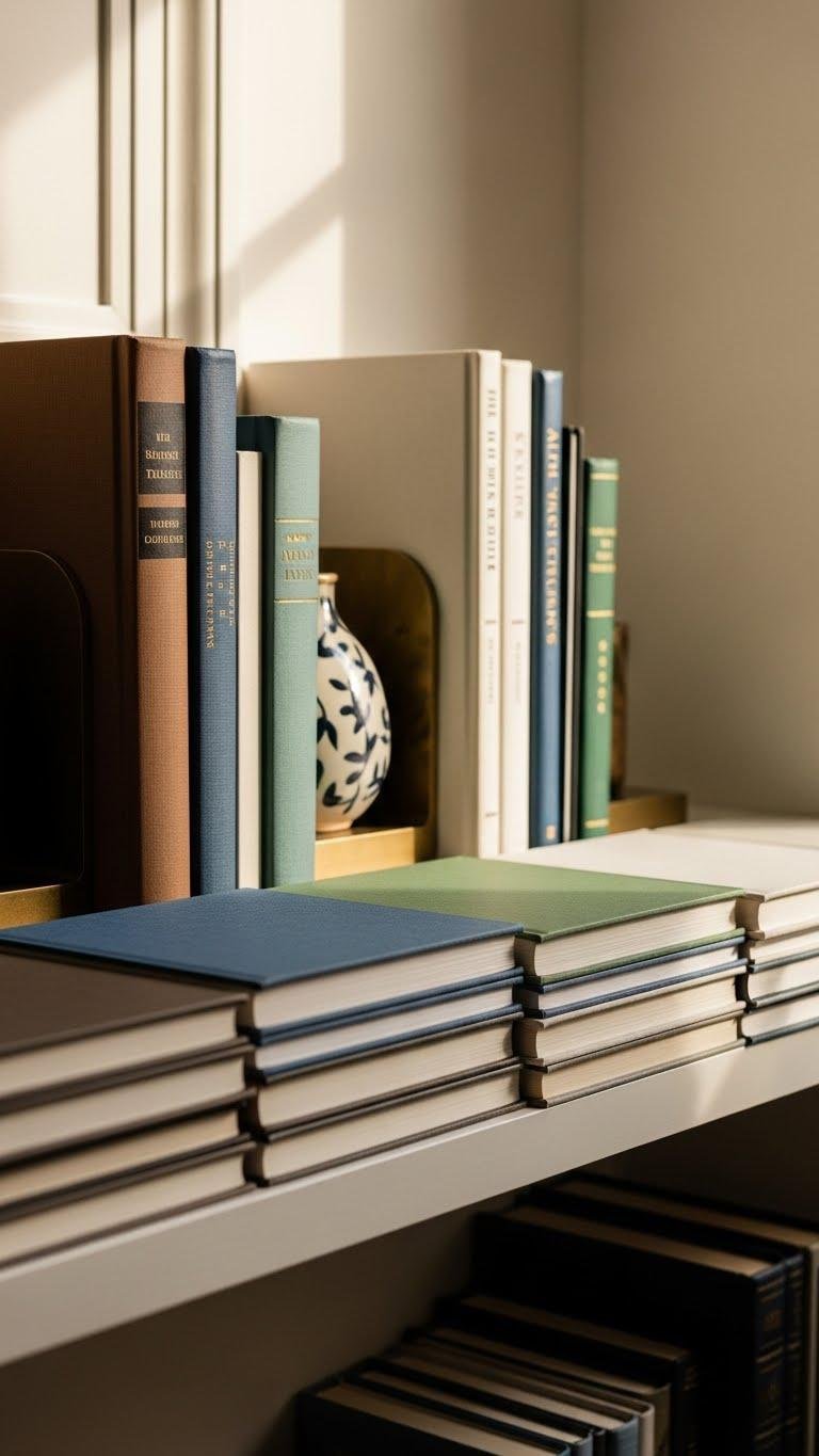 Stack a small pile of books to lift a sculptural object and instantly create hierarchy on the shelf—you’ll give the eye a clear place to land while adding height without extra hardware. Use books as sculptural pedestals, pairing varied sizes and textures. Anchor them with antique bookends for stability and character, then adjust spacing so each elevated piece reads intentional, grounded, and free.