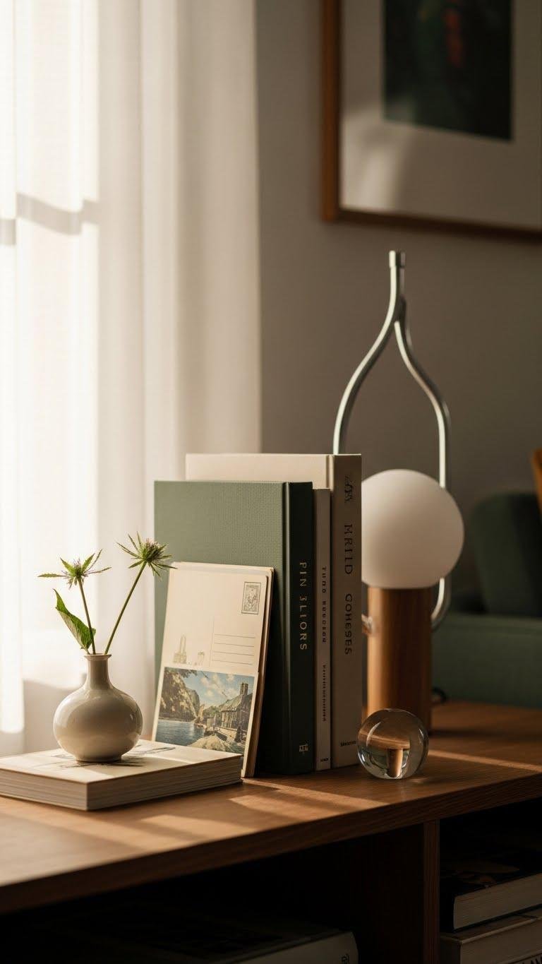Usually you’ll place smaller objects like a ceramic bud vase, a stack of postcards, or a sculptural paperweight directly in front of taller pieces to create depth and guide the eye. You’ll use front layering with scale models or delicate objects to punctuate height, control sightlines, and allow freedom in composition. Arrange intentional groupings, vary spacing, and keep proportions crisp.