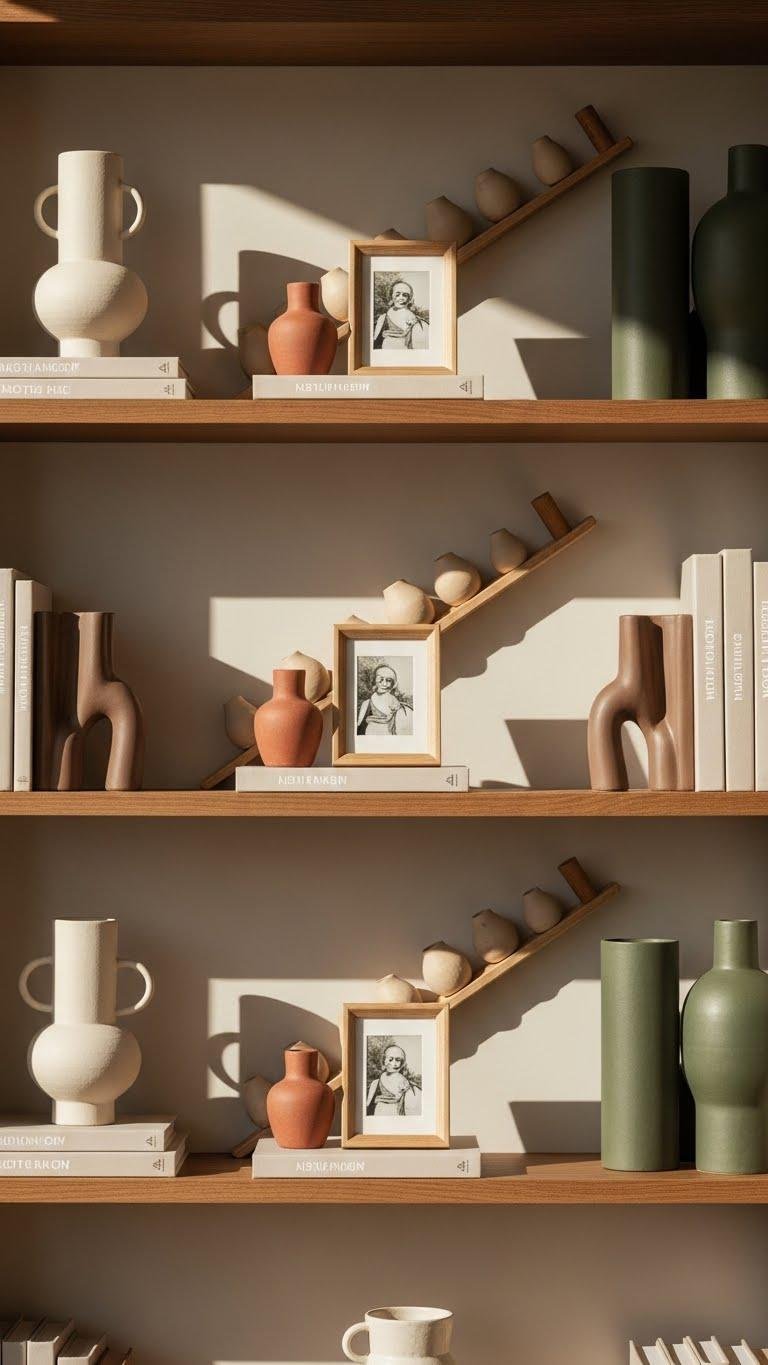Vary how many groupings you place on each shelf to create rhythm and prevent visual monotony; alternate single standout pieces with clusters of two or three to let the eye rest and then find interest.