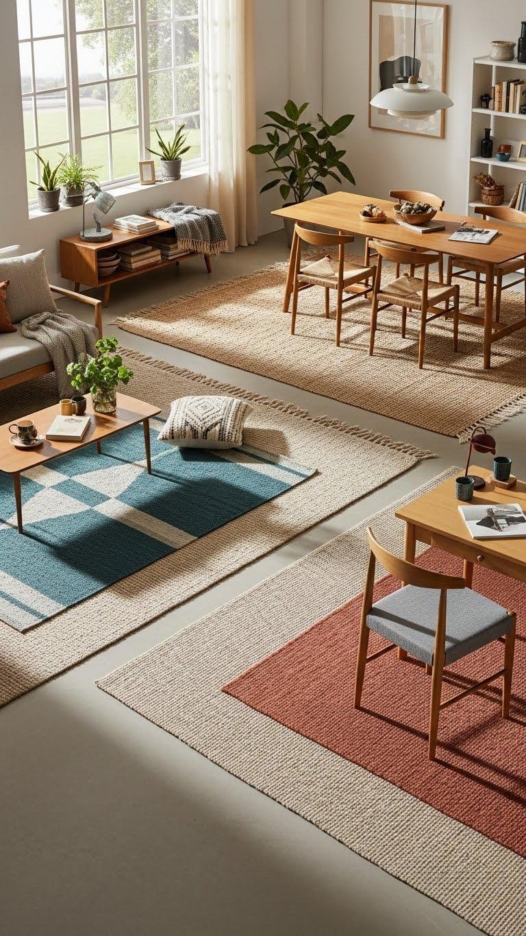 Think of rugs as visual anchors that quietly tell your eye where each zone begins and ends. You’ll use layered rugs to add texture without clutter, pairing a neutral base with a bold accent for pattern placement that guides movement.