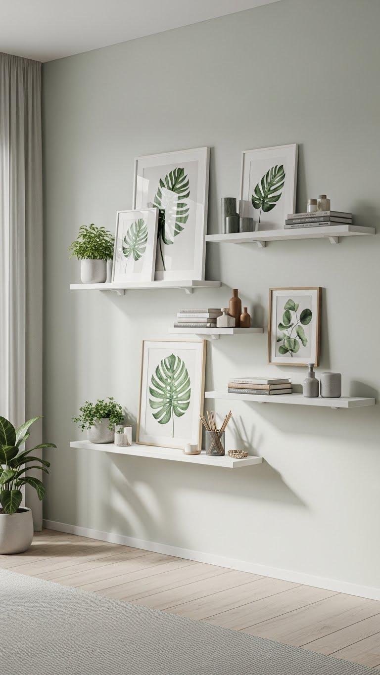 With a few sleek floating shelves mounted at varying heights, you’ll reclaim floor space and create instant visual layering without bulky furniture.