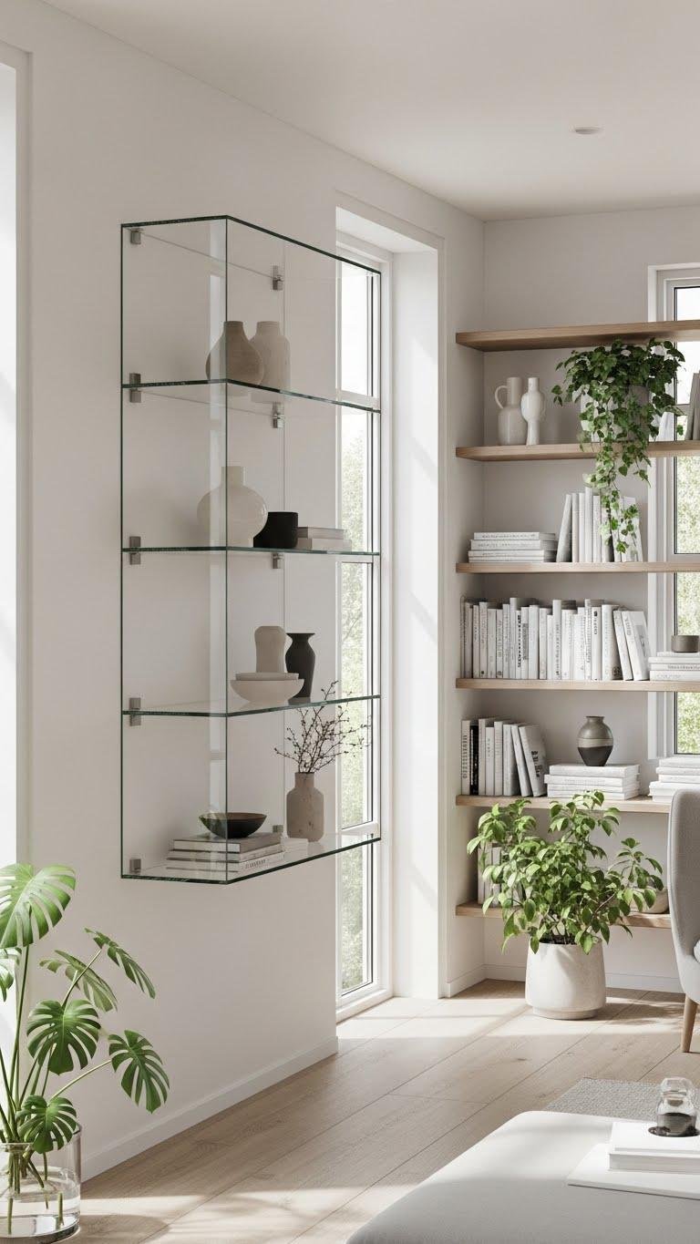 Choose a glass display to showcase curated objects without bulk, or mix open shelving for books and plants to stay flexible.