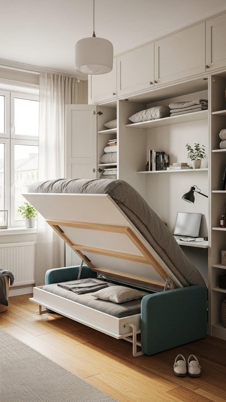 Flip up a Murphy bed and watch your tiny apartment breathe — you get a full-size sleeping surface that tucks away vertically, freeing floor area for daytime life.