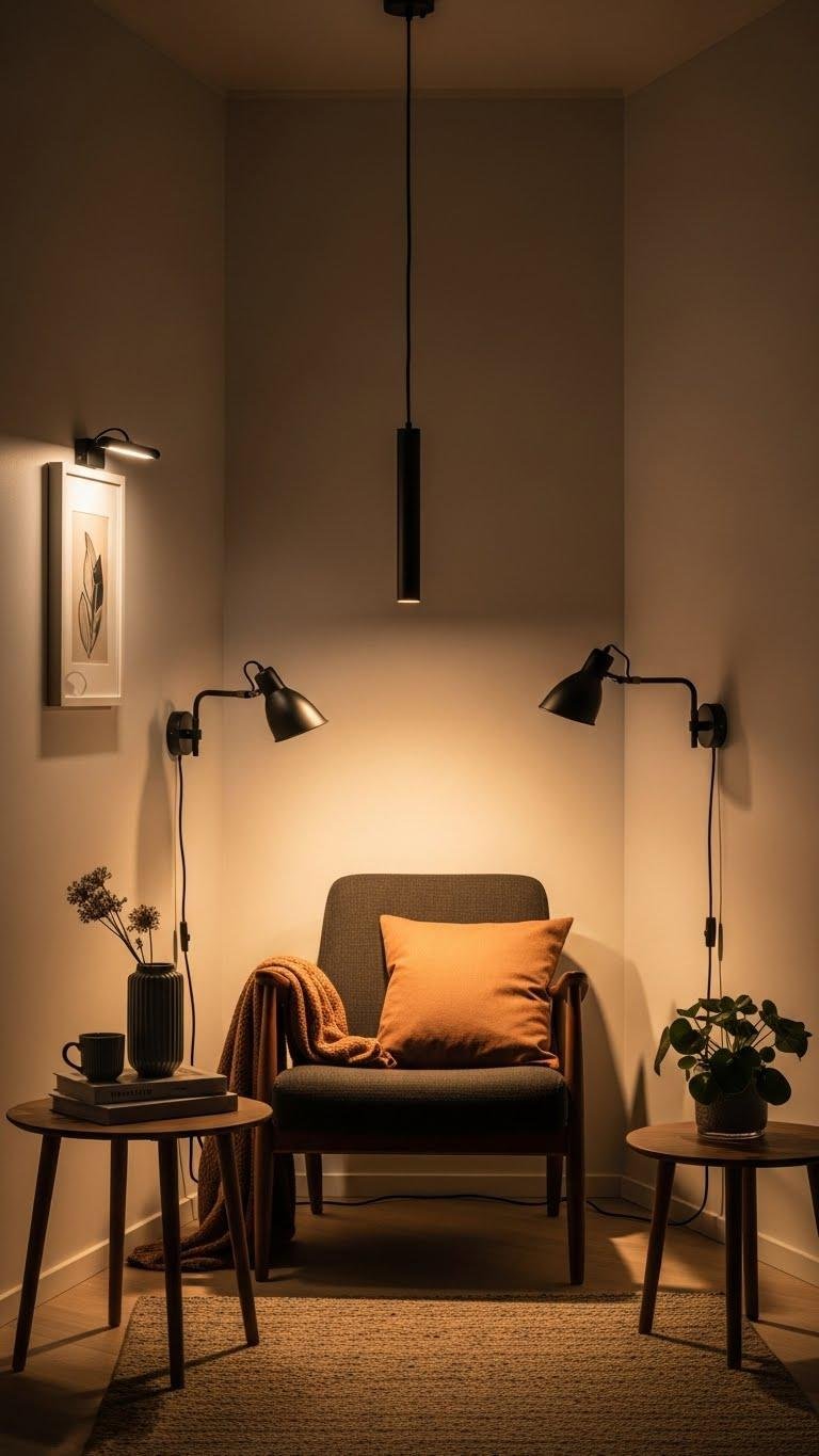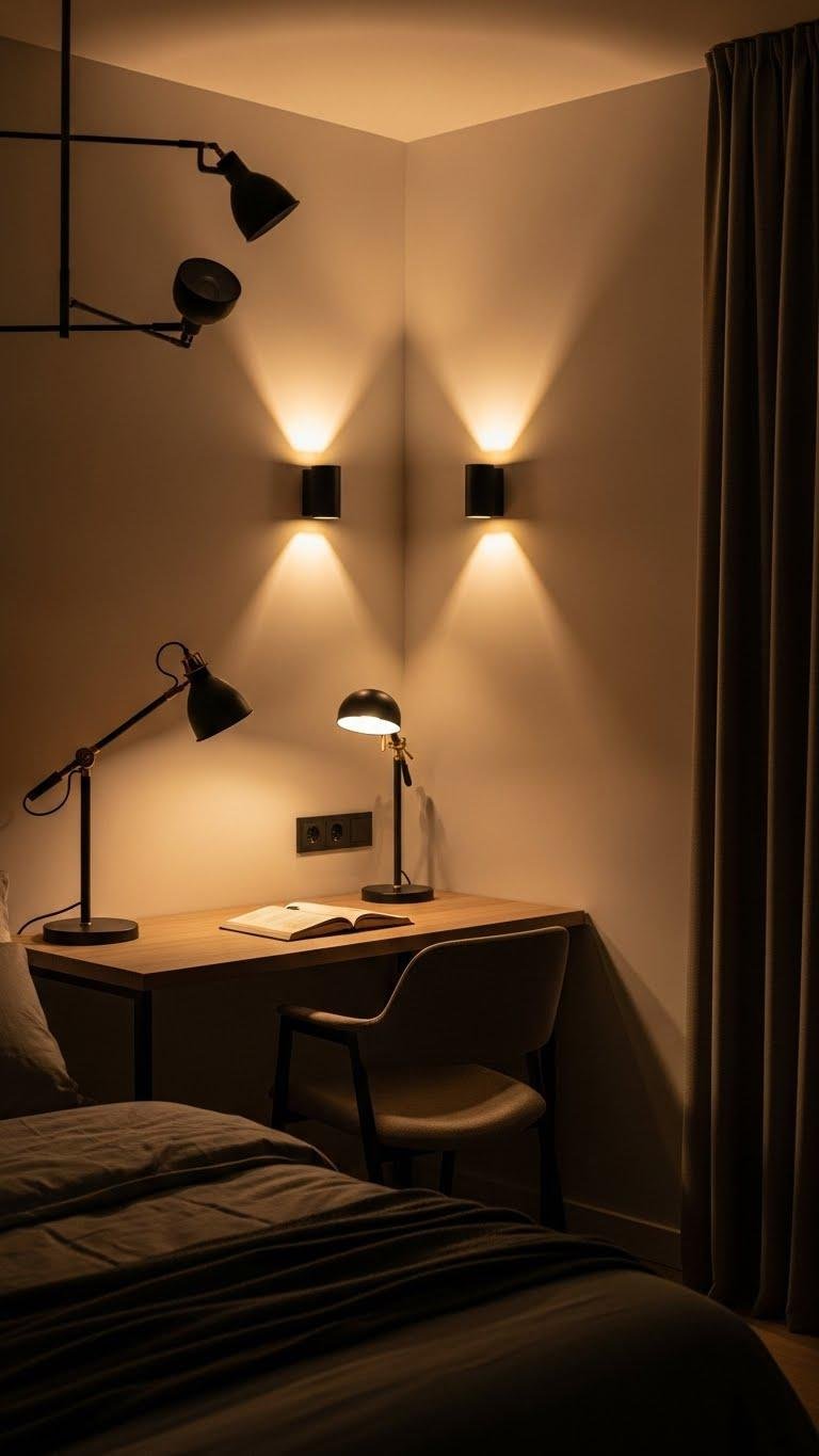 You’ll mix warm dimmers for mood, layered sconces for sculpting corners, and directional task lamps for work.