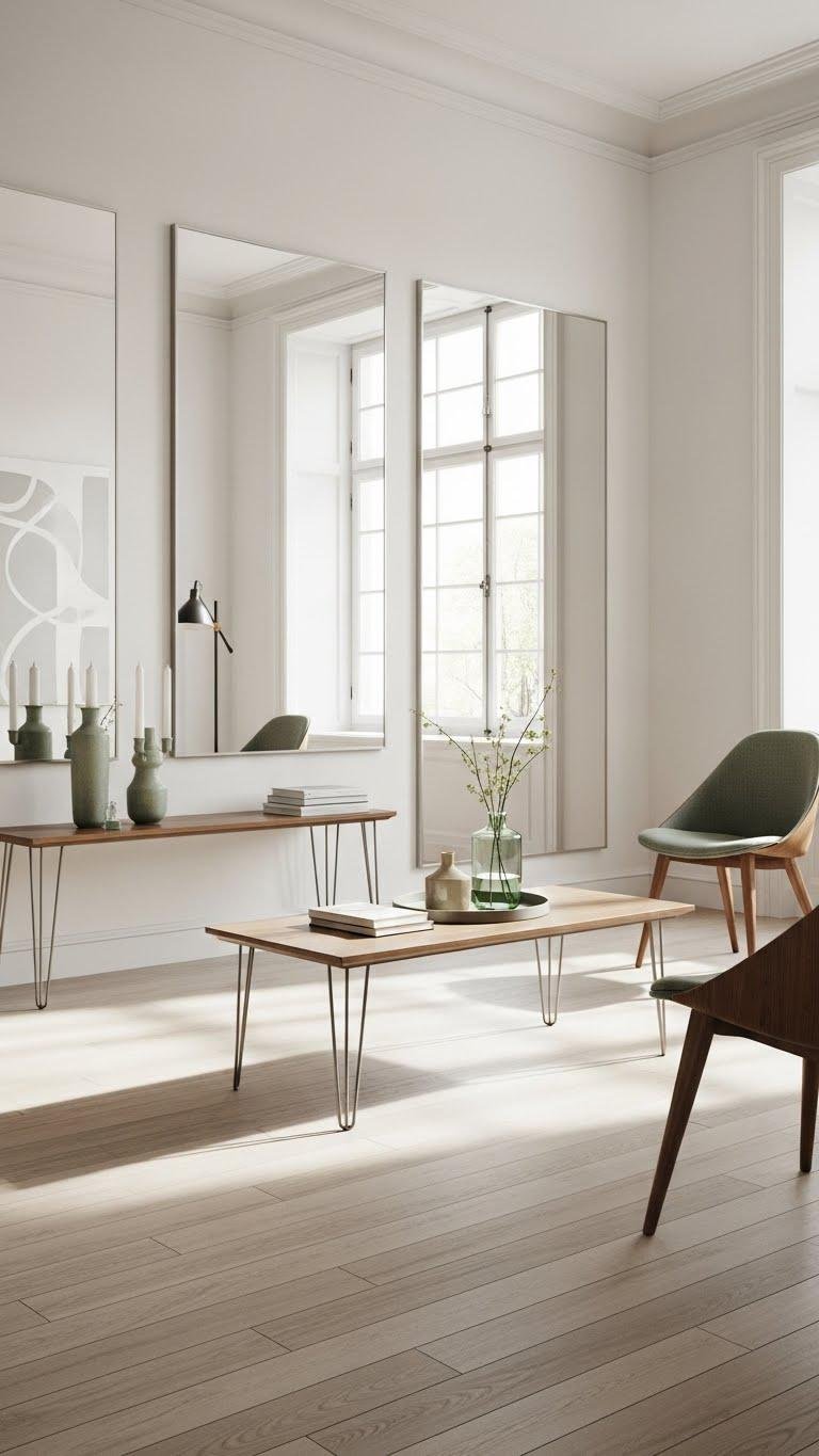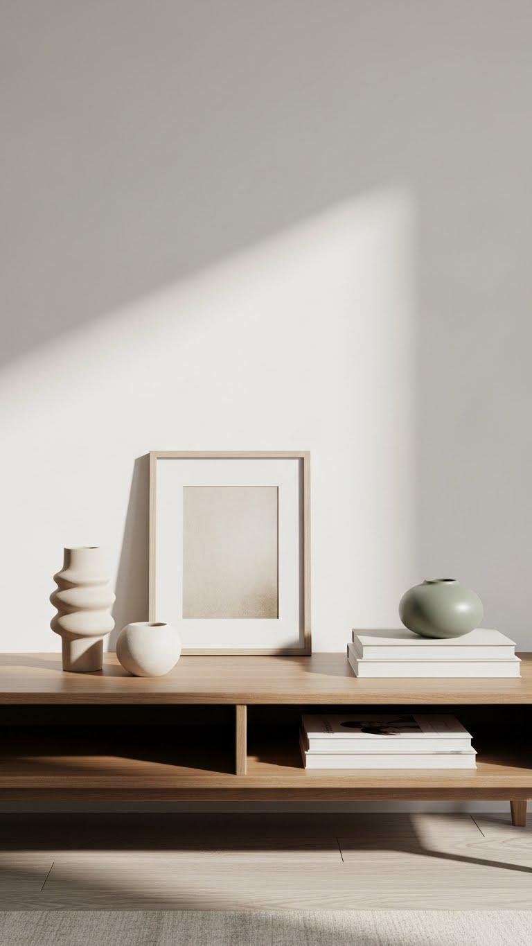 Add matte ceramics and a slim wood or metal table for contrast. Keep palettes restrained, surfaces mostly clear, and let a few textured pieces breathe — freedom through curated, airy surfaces and intentional touchpoints.