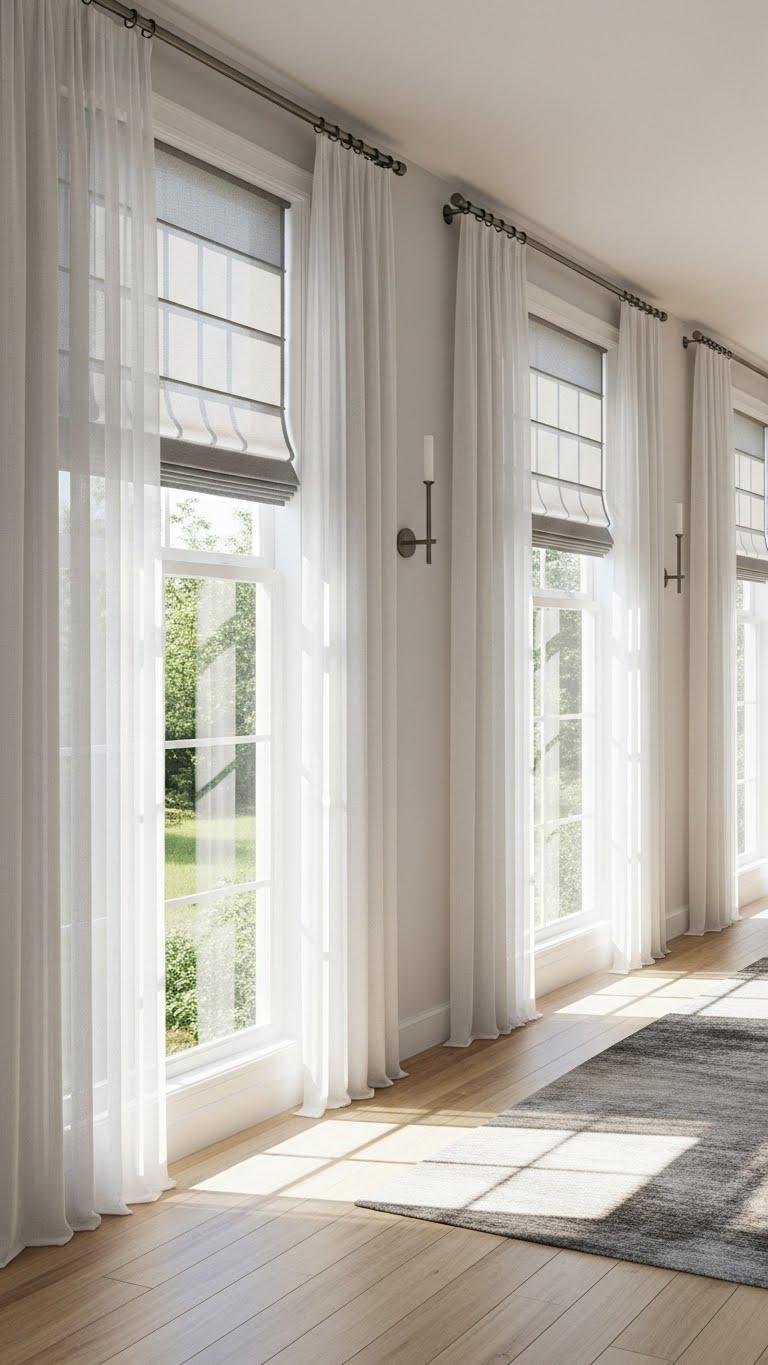 You’ll favor sheer panels for soft daylight and a breezy vibe, pairing them with streamlined roman shades for privacy when needed.