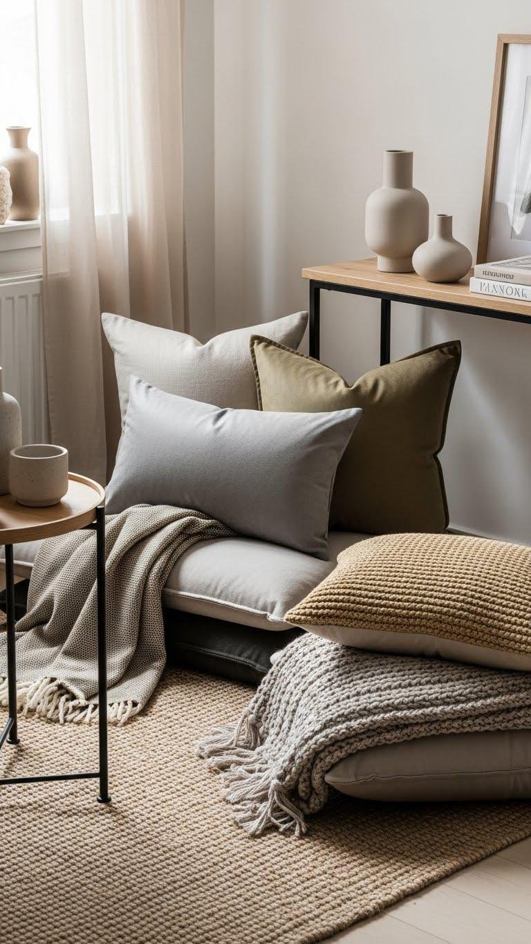 Introduce varied textures strategically to give a small apartment depth without clutter. You’ll layer tactile throws, a low-profile rug, and mixed-finish cushions to create warmth and movement.