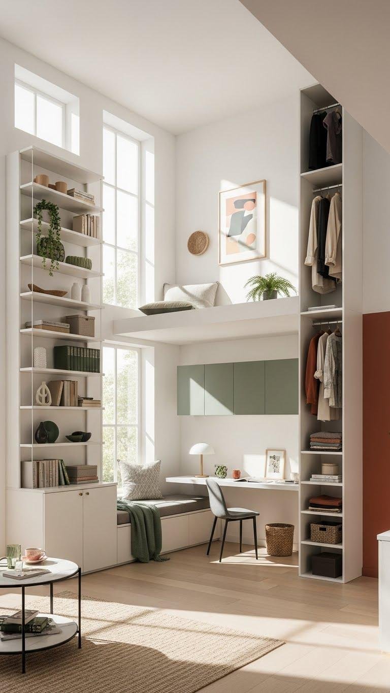 You’ll anchor a clean look with vertical cabinetry, using open shelves for curated items and hidden cabinets for clutter. Lofted closets create airy zones beneath for seating or a workstation, freeing you to live unboxed.