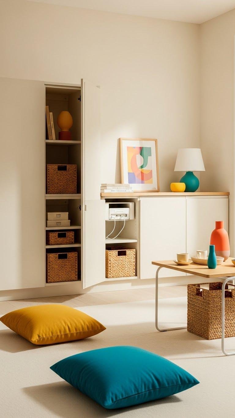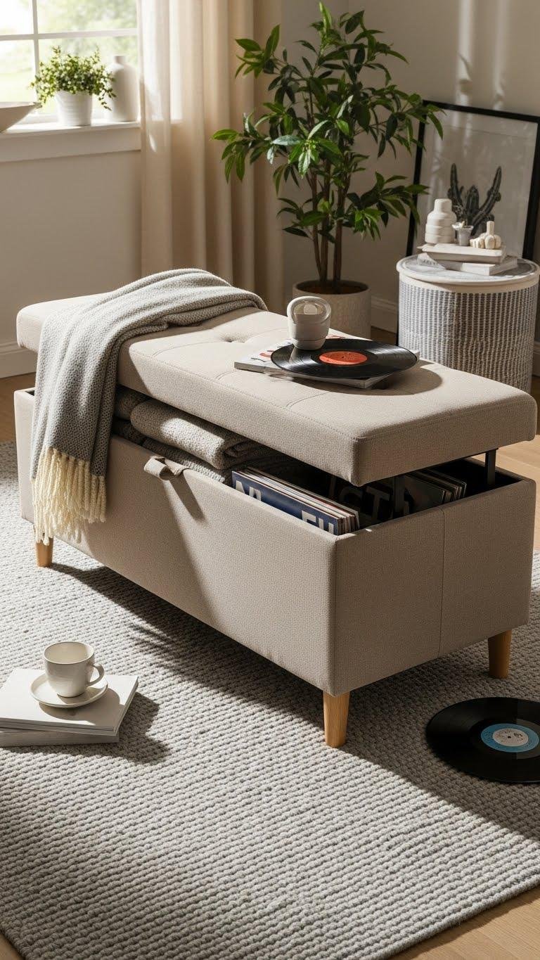 Maximize every inch by swapping a lone coffee table for a storage ottoman that doubles as extra seating, a hidden linen closet, and a laid-back footrest. Choose models with hidden hinges for clean lines and security, tufted tops for texture, and lightweight frames so you can move freely. Use neutral fabrics to anchor the room and stash throws, gear, or records out of sight.
