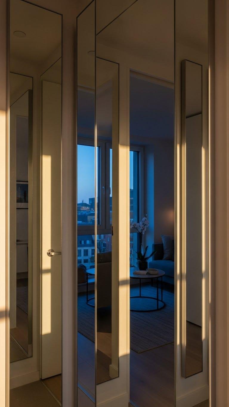 You’ll choose reflective art or slim mirrors with frameless edges, use angled placement to catch sun and city lights, and create layered reflections that multiply views. It’s a bold, airy move that keeps your tiny place feeling limitless.
