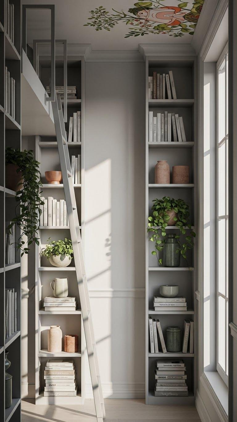 Add a removable loft ladder for access and a painted ceiling mural above shelves to extend the room’s drama.