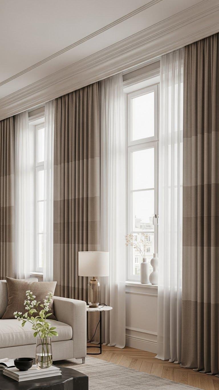 When you hang curtains closer to the ceiling, they visually stretch the room and make windows feel taller; mount the rod just a few inches below the crown molding or an inch or two above the window frame to maximize that vertical pull. Go floor to ceiling with illusion panels, use rod concealment for clean lines, and practice fabric layering to add texture without clutter — it frees your space.