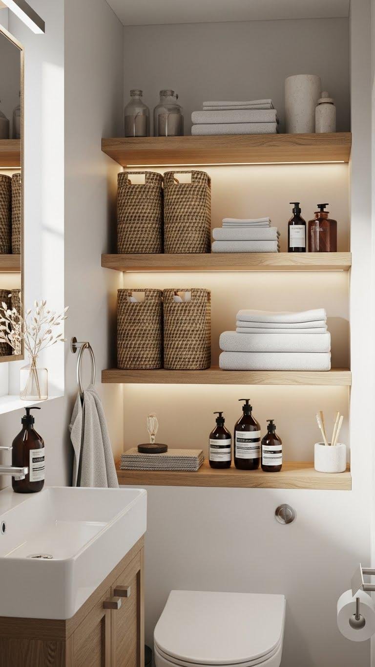 Tucked above your sink or toilet, floating shelves transform wasted wall space into sleek, accessible storage — think stacked towels, baskets, and curated toiletries that double as decor.