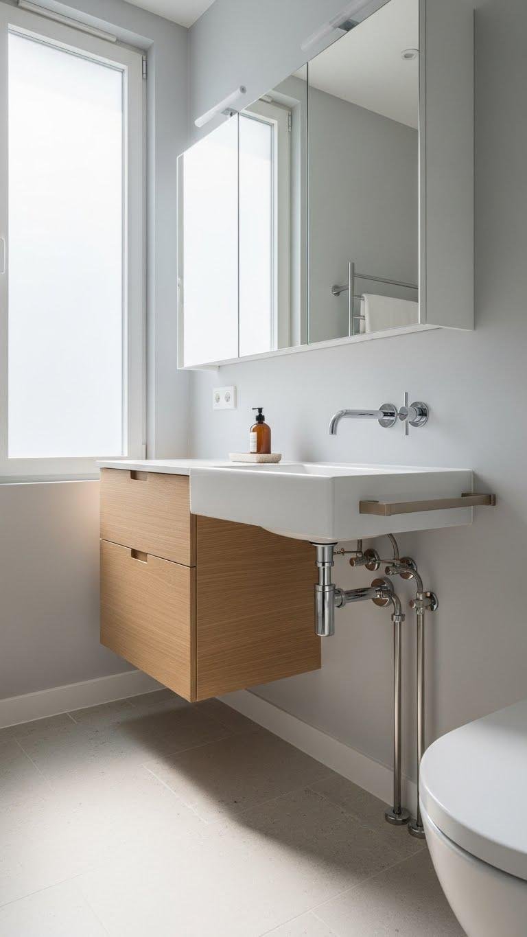 Choose a sleek floating vanity to create negative space, add drawers for hidden storage, and embrace minimalism.