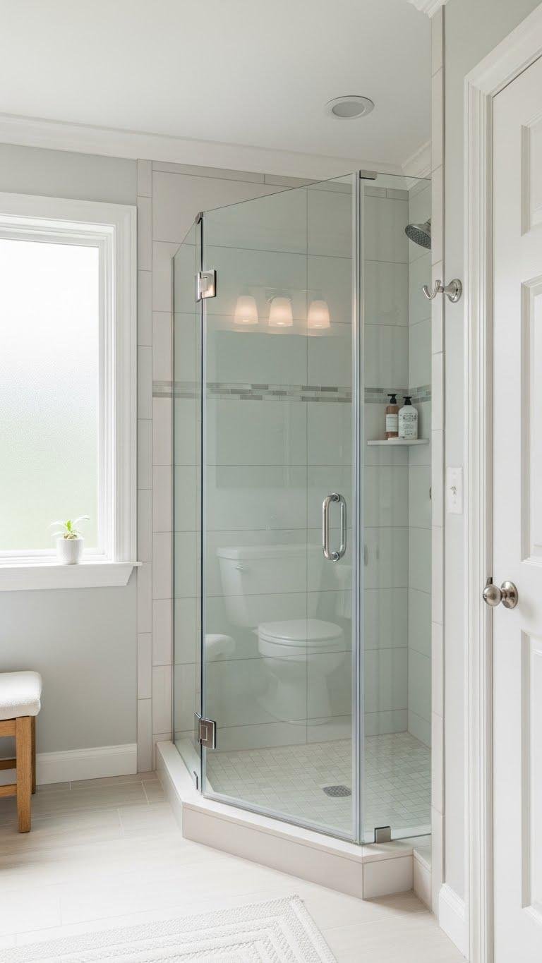 You’ll love the airy feel as an angled entry softens shifts and a compact, space saving base creates circulation. Pick clear glass, light tile, and minimal hardware so the room breathes and movement feels effortless.