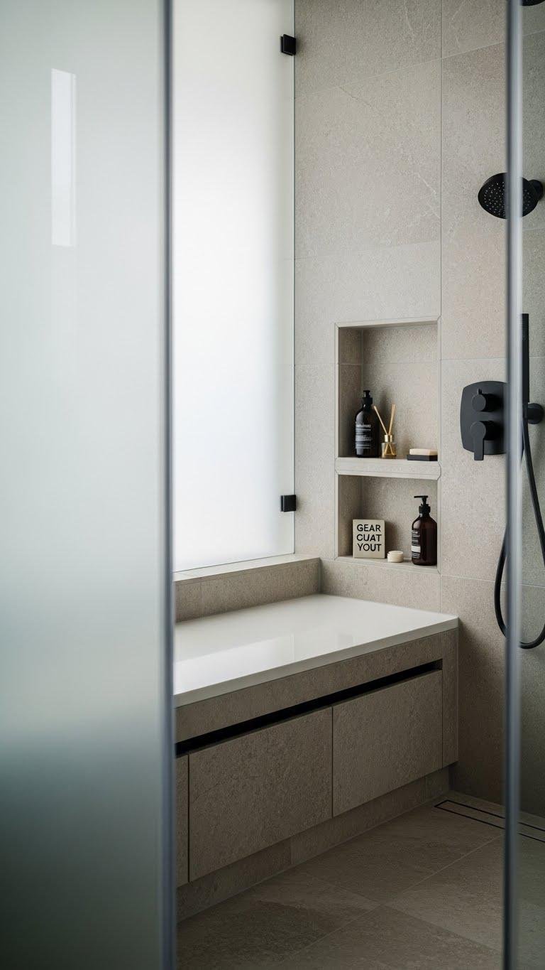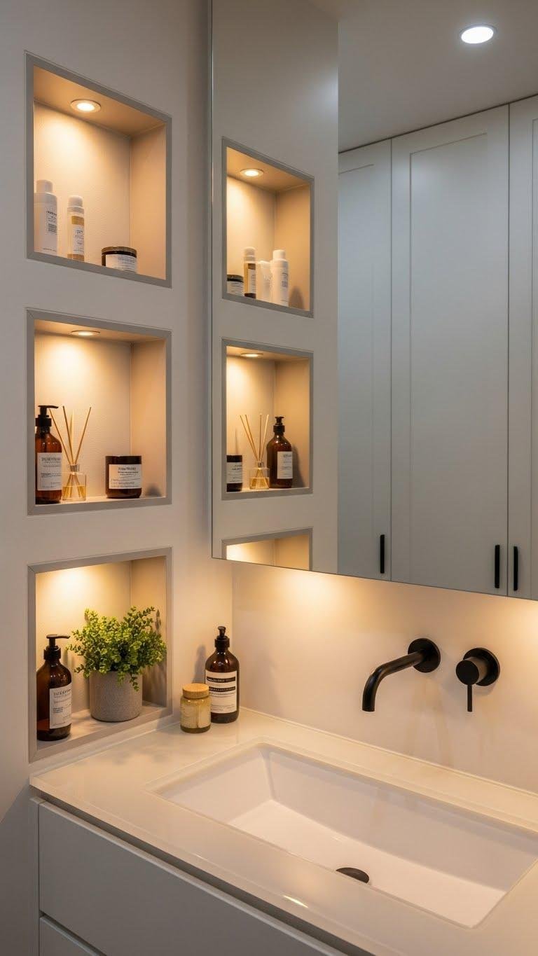 If floor-to-ceiling cabinets give the room a built, streamlined feel, recessed shelving keeps that clean look down at counter level. You’ll free countertops by carving hidden niches into walls for toiletries and plants. Pair shallow shelves with recessed lighting to highlight objects and create depth. The result feels airy and uncluttered, a small bathroom that reads bigger and more intentional without sacrificing style.