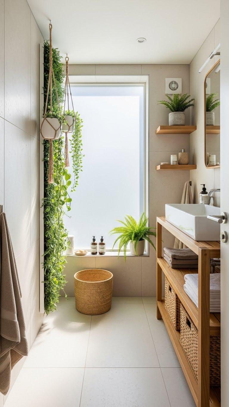A few well-chosen plants, natural textures, and daylight cues can make a small bathroom feel larger and calmer; you’ll use greenery, wood, and stone to blur boundaries between inside and out while keeping sightlines open. Add a slim living walls panel, hanging pots, and a teak shelf. They’ll brighten, scent, and expand your space without clutter, reinforcing a free, airy vibe.