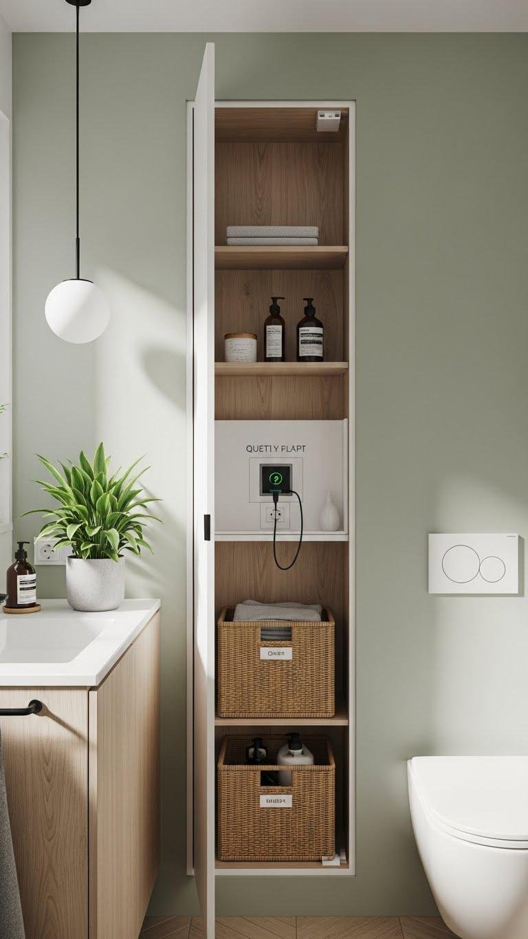 Greenery and open sightlines set a calm scene, but small bathrooms still need smart storage to keep that spa-like look. Recessed cabinets hide cords and products, creating a clean silhouette.